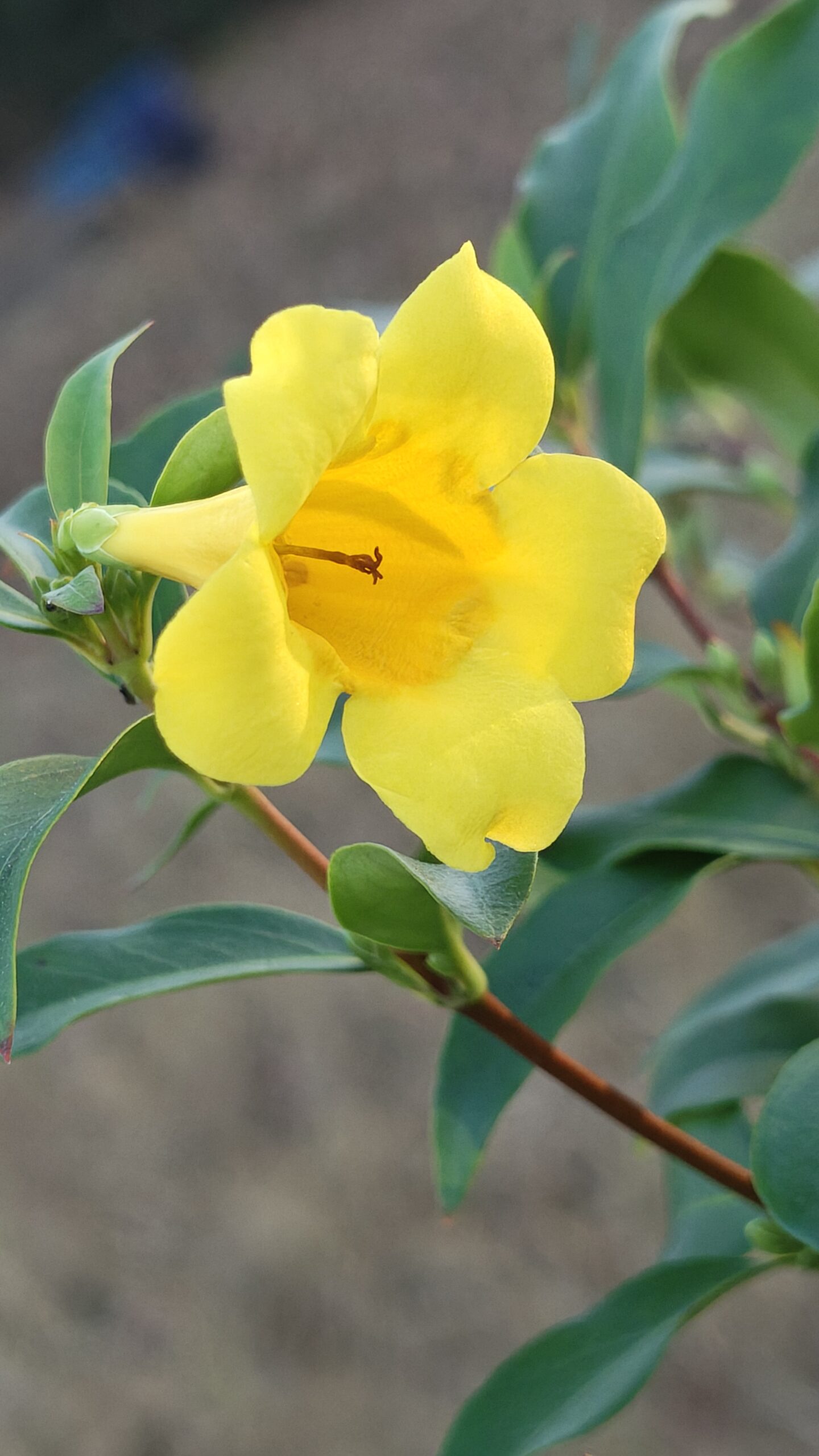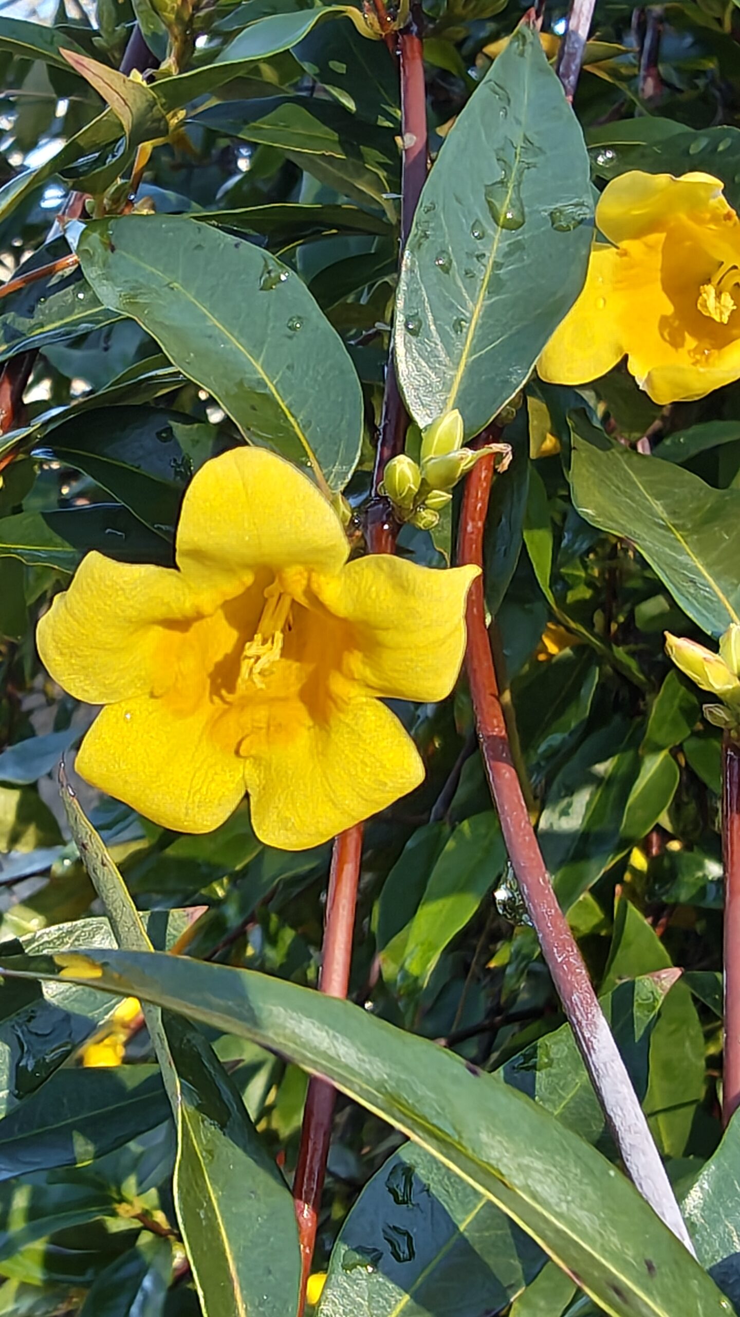 I grow my Carolina jessamine (2 plants) in a very sandy, fairly dry area of the farm, where they get full sun and have to compete with all kinds of wild vegetation and weed. I deep-watered them during Summer once every few days when I first planted them two years ago. But after one growing season, they seem to have established quite well, and I only deep water them once a week during Summer. The perennial vine can flower in Fall, but mine really bloom in Spring (usually February through May). In fact they started blooming in December because of the mild winter we are having. And they actually do okay in the cold, even when temperature dips below freezing for a night or two. Both datura and brugmansia got major cold damages during those cold nights, but Carolina jessamine sustained little to no damage. The foliage generally bronzes in winter.[2]